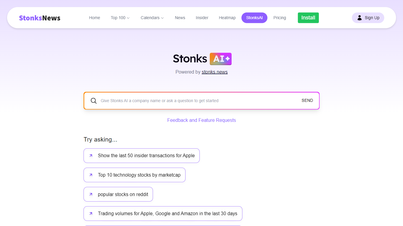 Stonks News is a cutting-edge AI-powered platform focused on delivering the most relevant and timely stock market information. This robust natural language search tool allows investors and market enthusiasts to quickly access and accurately find the latest stock movements, insider transactions, trading volumes, and stock charts for comparison. The website is intuitively designed with a user-friendly interface, featuring key sections such as Top 100 stocks, insider trading updates, and a heatmap to visualize market trends. Stonks News simplifies market data analysis and empowers users to make informed trading decisions with efficiency and precision. Incorporating feedback and feature requests, Stonks News continues to refine its offerings to serve a growing community of informed traders and investors who rely on accurate and accessible financial information.