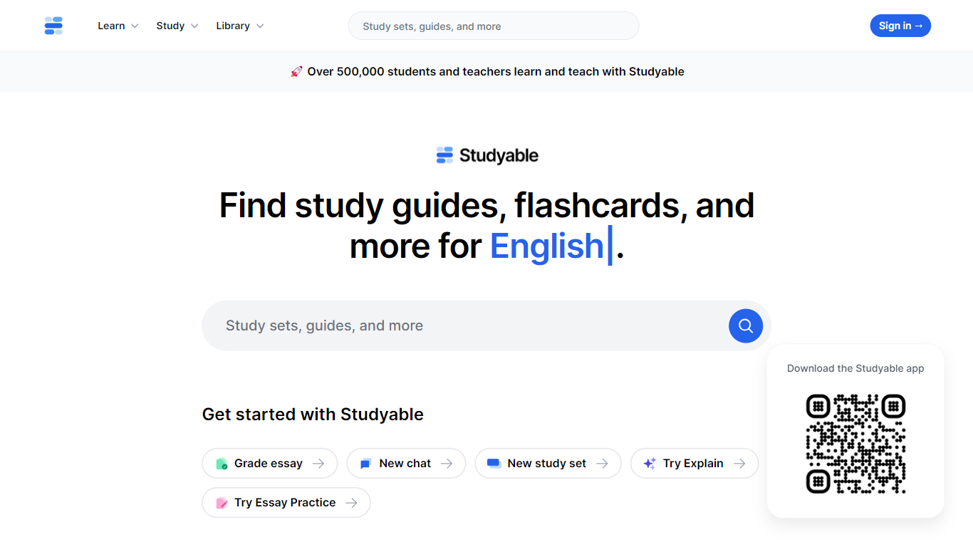 Supercharge your studying with Studyable. Explore millions of study guides and flashcards for every subject, and receive feedback on your essays from our advanced AI.