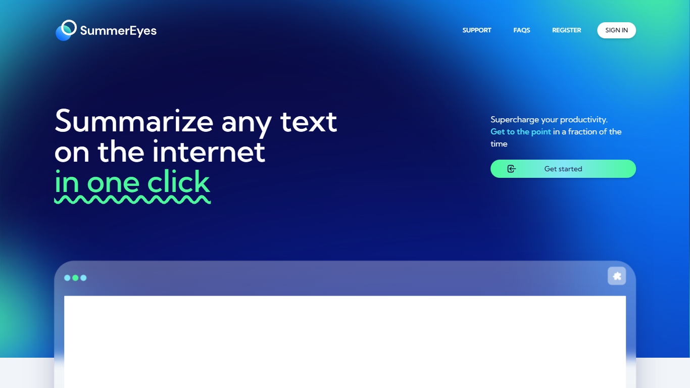 Accelerate Your Online Reading Experience with SummerEyes! This innovative Chrome extension promises to revolutionize the way you interact with text on the internet. Designed to enhance productivity, SummerEyes allows you to summarize any web text with just one click, helping you distill information down to its key points and save precious time. Users benefit from an impressive average reading speed increase of 70%, translating to about 30 minutes saved each day. SummerEyes is not only lightning-fast but also incredibly convenient, living right within your browser. It leverages the most current advancements in Natural Language Processing to deliver quick, on-the-spot summaries. Whether it’s long articles, dense emails, or extensive newsletters, SummerEyes helps you cut through the clutter and focus on what truly matters. Installation is a breeze, and once set up on a supported device, this powerful AI-driven tool is ready to streamline your online reading. Get ahead with SummerEyes—the essential browser extension for the fast-paced digital world.