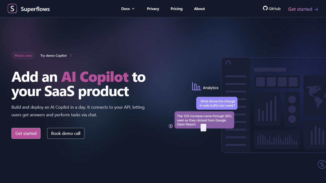 Superflows is the ultimate solution to make your product as user-friendly and intuitive as ChatGPT. With its advanced natural language processing capabilities, ChatGPT Copilot seamlessly integrates into your software, providing personalized assistance to users at every step.