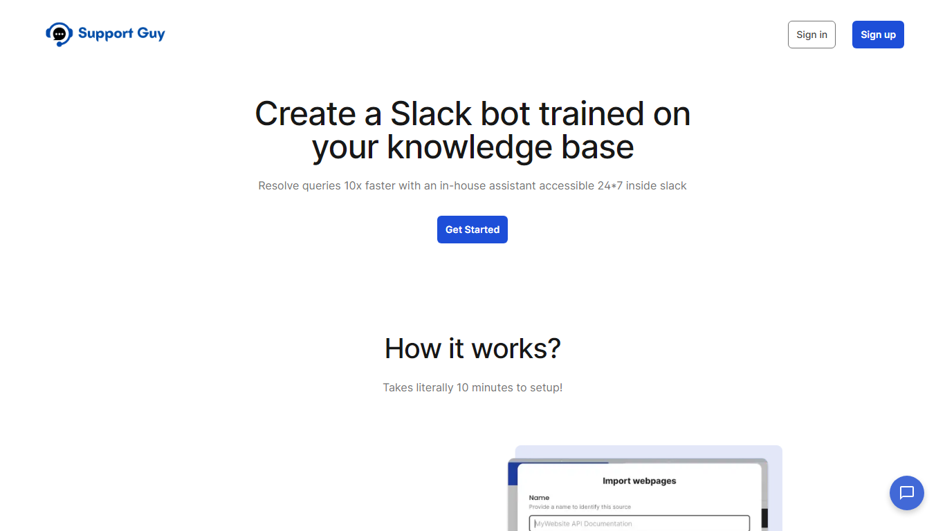 Setting up is a breeze; in just 10 minutes, you can have your own SupportGuy Slack bot. Import knowledge from various sources—whether it’s your website content, a collection of links, or PDF documents, SupportGuy integrates smoothly into your workspace.