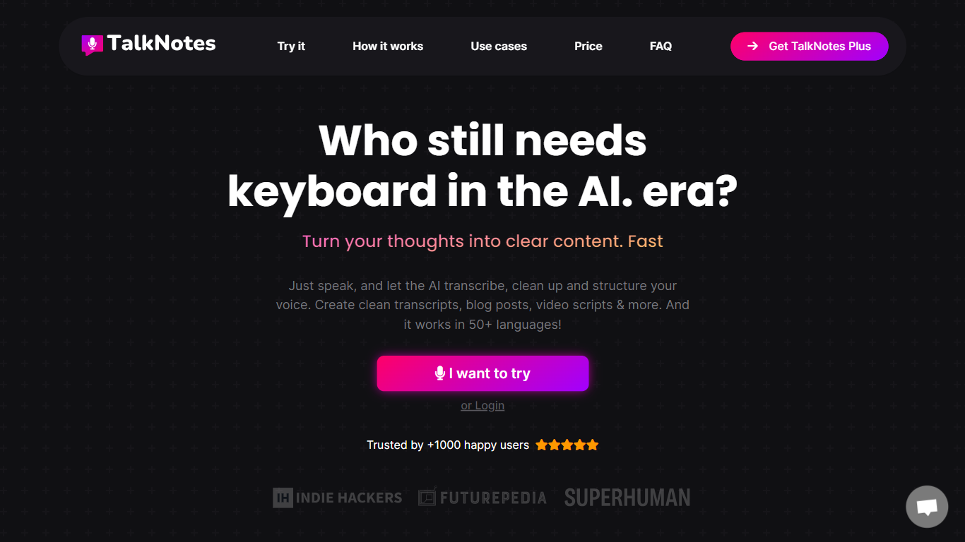 Just speak, and let the AI transcribe, clean up and structure your voice. Create clean transcripts, blog posts, video scripts & more. And it works in 50+ languages!