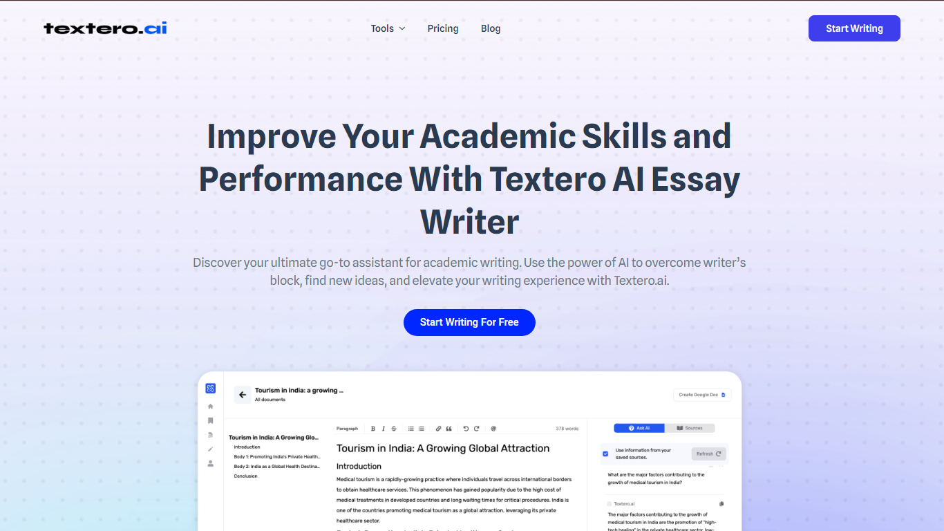 Elevate your academic writing with Textero AI Essay Writer, your ultimate resource for crafting flawless essays. This advanced writing assistant leverages AI technology to help you overcome writer’s block, discover new ideas, and provide academic sources complete with citations. It ensures all your essays are plagiarism-free, high-quality, and backed by factual information. With its user-friendly interface, Textero AI offers tools like AI PDF Summarizer, AI Research Tool, and Outline Generator to streamline your writing process. Start writing for free and enjoy a seamless writing experience that enhances your skills and performance.