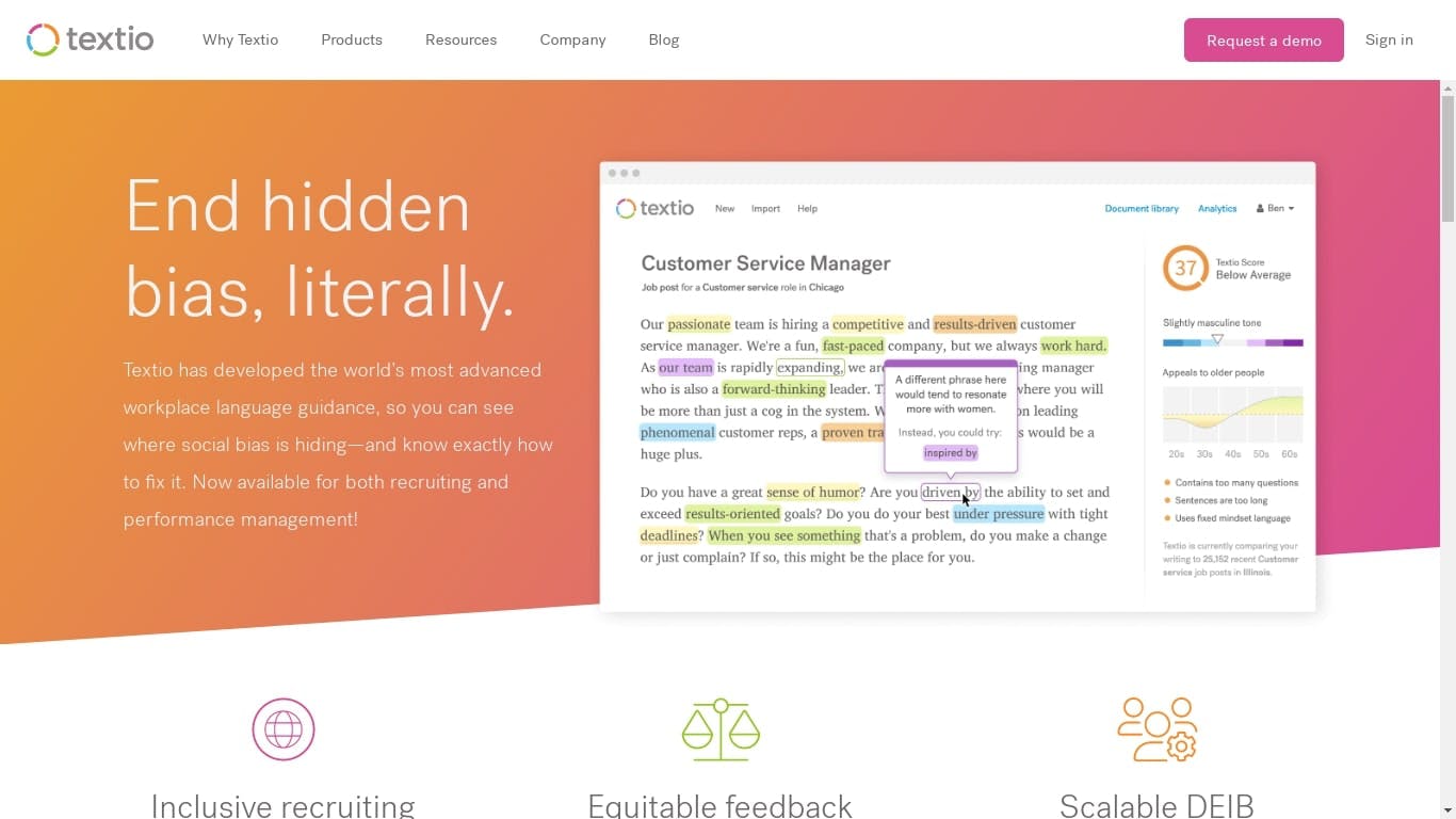 Textio is a tool that helps interrupt bias in performance feedback and recruiting by providing advanced inclusive language guidance for your work. With Textio, you can get powerful DEIB data insights and metrics that help you identify and eliminate bias in your language and communication. Whether you’re giving performance feedback or recruiting new team members, Textio can help you create more inclusive and effective communication. It’s a valuable resource for anyone looking to improve their communication skills and create a more diverse and inclusive workplace. If you want to interrupt bias and improve your communication, Textio is a tool to consider.