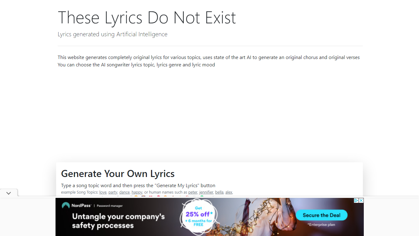 Unleash your musical creativity with the Artificial Intelligence Songwriter – a revolutionary website that generates completely original lyrics for any theme you imagine. From dance to love, or even using emojis, the state-of-the-art AI crafts both chorus and verses tailored to your choices. Select from a range of genres including Country, Metal, Rock, Pop, Rap, and EDM, and set the emotional tone from very happy to very sad. Experience the joy of songwriting without the writer’s block, and if the generated lyrics don’t quite hit the mark, simply regenerate for a fresh batch of AI-crafted poetry. Perfect for musicians, lyricists, and anyone seeking inspiration or entertainment, These Lyrics Do Not Exist offers a seamless lyrical journey.