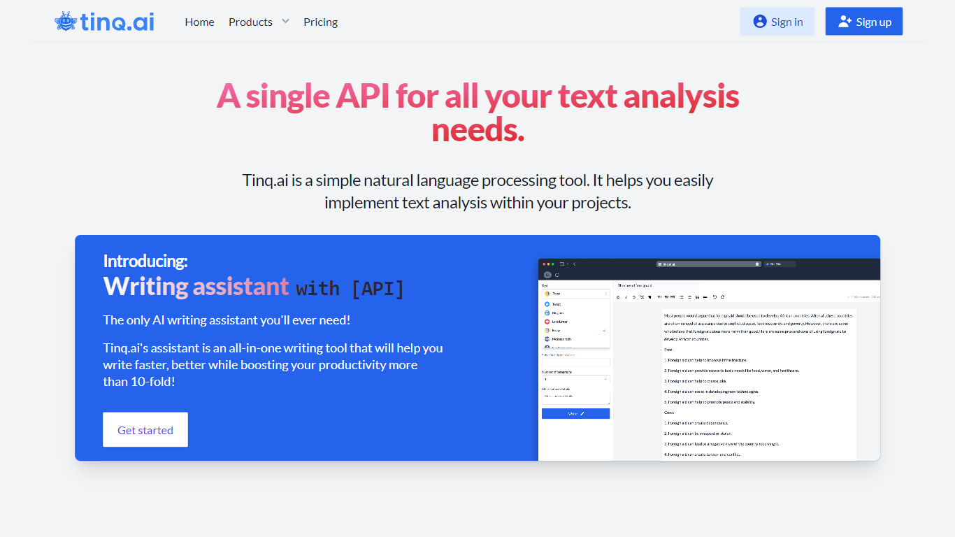 Tinq.ai is a powerful and efficient natural language processing tool that allows you to easily implement text analysis within your projects. With Tinq.ai, you can streamline your writing process, enhance your productivity, and improve the quality of your content.