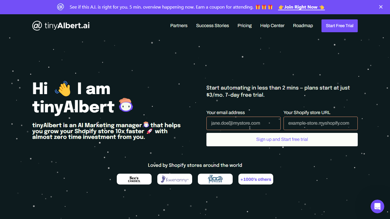 Welcome to the world of seamless email marketing with tinyAlbert, your own AI Marketing Manager for Shopify. tinyAlbert is designed to revolutionize how you engage with customers and drive sales for your Shopify store. With a quick setup time of less than 2 minutes and affordable plans starting at just $3 per month, you can start automating your marketing efforts in no time. Embark on a 7-day free trial and watch tinyAlbert help you grow your business 10x faster, with minimal time investment on your part.