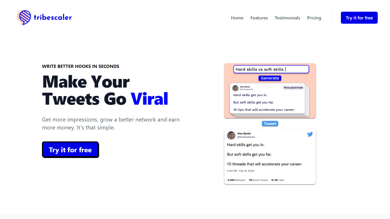 Welcome to Tribescaler, the innovative platform designed to amplify your social media presence and take your tweets to the next level. With our cutting-edge solution, you can unlock the true potential of your Twitter content and make your tweets go viral. Tribescaler uses powerful analytics and strategic methods to increase your tweet engagement. Our user-friendly interface facilitates easy tracking of performance metrics, ensuring you always know how well your tweets are doing. Dive into the world of strategic tweeting with Tribescaler and watch as your online influence grows!