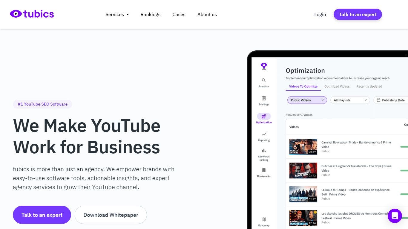 tubics helps you to create data-driven videos ideas, get suggestions for titles and descriptions. Powered by AI you can grow your organic videos views on YouTube and rank your videos on Google.
