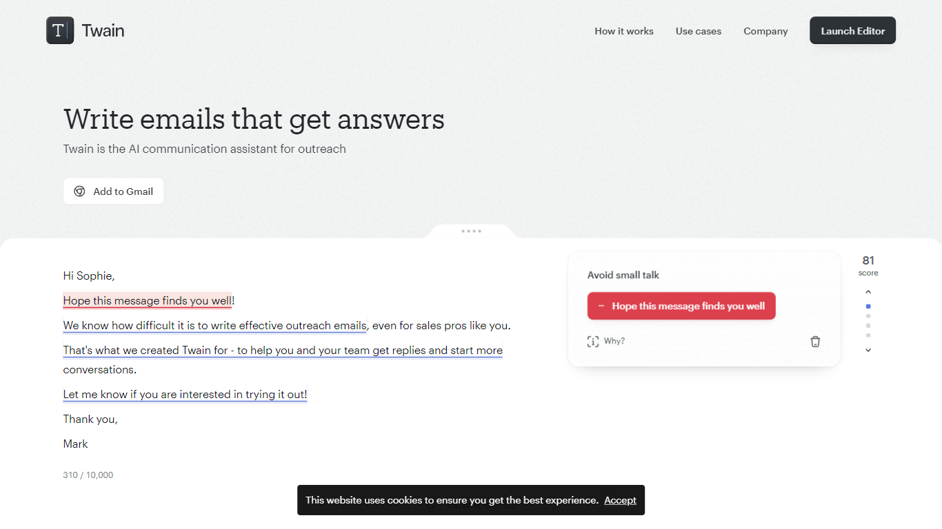 - **Improvement Suggestions**: Simply insert your outreach message into Twain’s editor and see how it can be improved. Twain will highlight areas where you can improve your opener avoid filler words and ask clear questions.