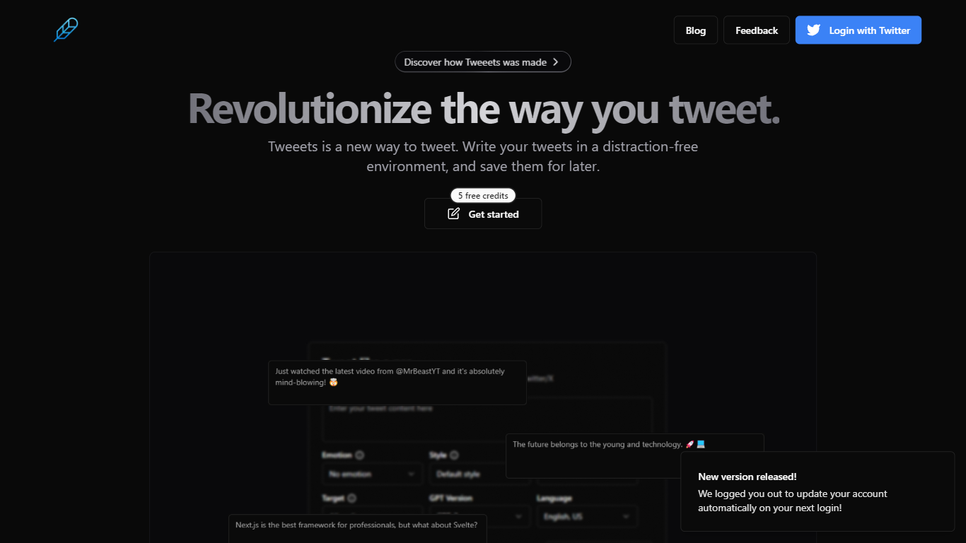 Tweeets offers a fresh approach to tweeting, shaping the future of how we engage with social media. This innovative platform provides a distraction-free environment ideal for crafting thoughtful and impactful tweets. With Tweeets, users are able to compose their tweets and save them for later, ensuring that their social media content is deliberate and prepared at their convenience. With over 507 tweets generated and 186 users registered, Tweeets is quickly becoming a go-to tool for individuals looking to improve their Twitter presence. Whether you are a seasoned twitterati or new to the platform, Tweeets simplifies the tweet-writing process and gives you the tools to create and refine your messages until they are ready to be shared with the world.