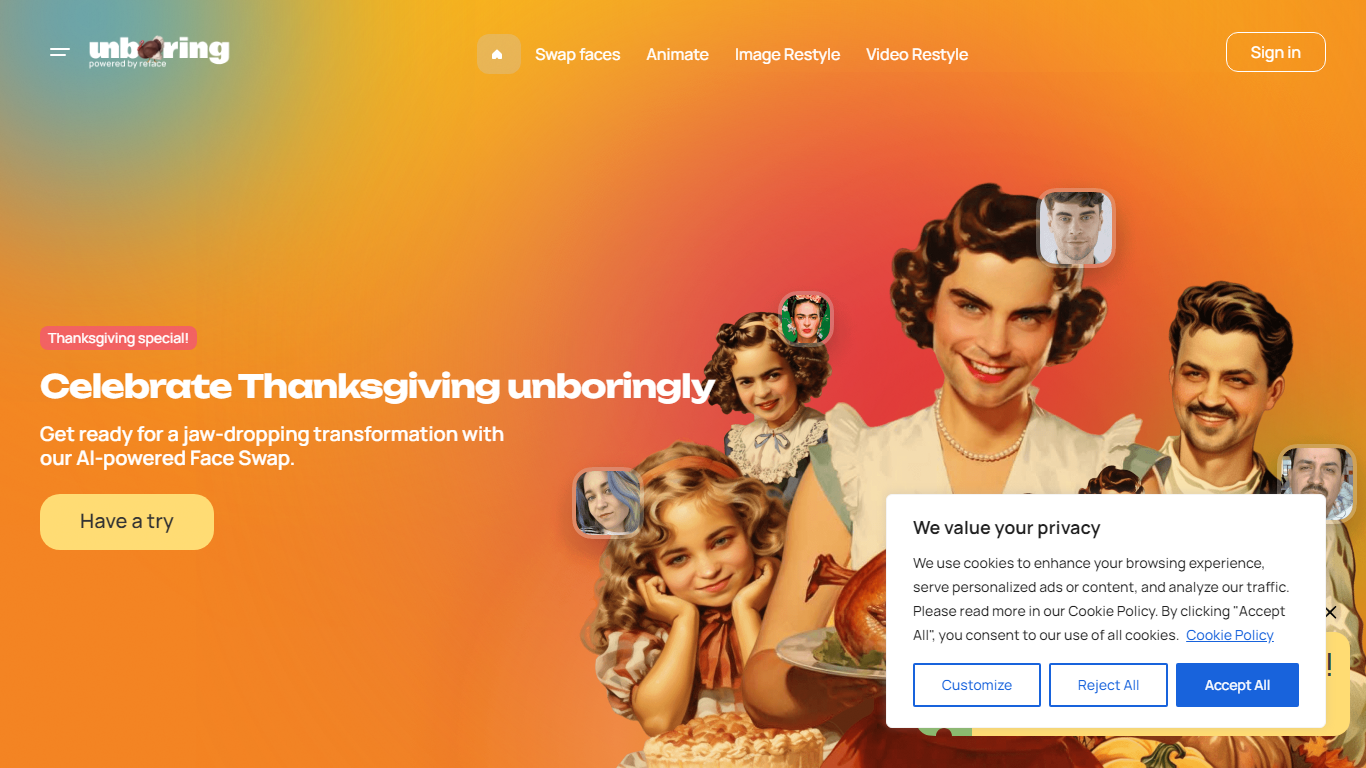 Video Restyle elevates your content to new heights by applying mesmerizing filters for stunning visual effects. Whether you’re looking to spice up your Thanksgiving celebrations, poke fun at friends with memes, or add life to family photos, Unboring has got you covered with incredibly fast, user-friendly, and AI-driven solutions. Best of all, no professional editing skills are required – we guarantee hilariously amazing results in just a few clicks!