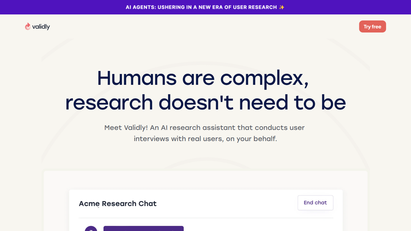Validly is leading the charge into a new era of user research with innovative AI agents designed to simplify complex processes. These AI research assistants are revolutionizing the field by conducting user interviews autonomously, providing businesses with the opportunity to obtain valuable insights without the traditional hassle and overhead of manual methods. With the ability to perform hundreds of interviews simultaneously, Validly offers scalability and efficiency, significantly reducing the time, effort, and costs that typically impede research processes.
