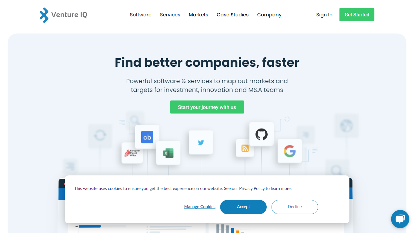 Venture IQ empowers M&A, investment, and innovation teams with data-driven insights. With smart automation and human expertise, we can help you find, understand, and close more deals, saving you time filtering through the noise.