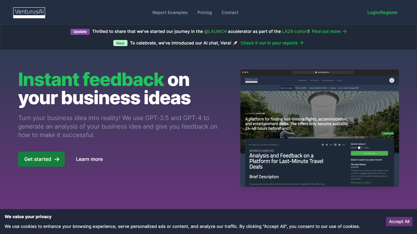 VenturusAI is an innovative platform designed to help entrepreneurs and business owners transform their ideas into successful ventures. Leveraging the power of GPT-3.5 and GPT-4, VenturusAI provides instant feedback through detailed business analysis that includes SWOT, PESTEL, and Porter’s Five Forces assessments. With a user-friendly interface, clients can easily navigate and utilize the platform’s offerings to gain comprehensive insights into their target audience — complete with user stories and demographic data. VenturusAI’s tools offer customized business strategies, insightful marketing and branding guidance, and identification of groundbreaking ideas and opportunities to help differentiate and enhance your business model. Celebrating milestones such as the new AI chat, Vera, and the company’s induction into the @LAUNCH accelerator as part of the LA29 cohort, VenturusAI is committed to constant improvement and innovation, creating value for its thriving community of entrepreneurs.