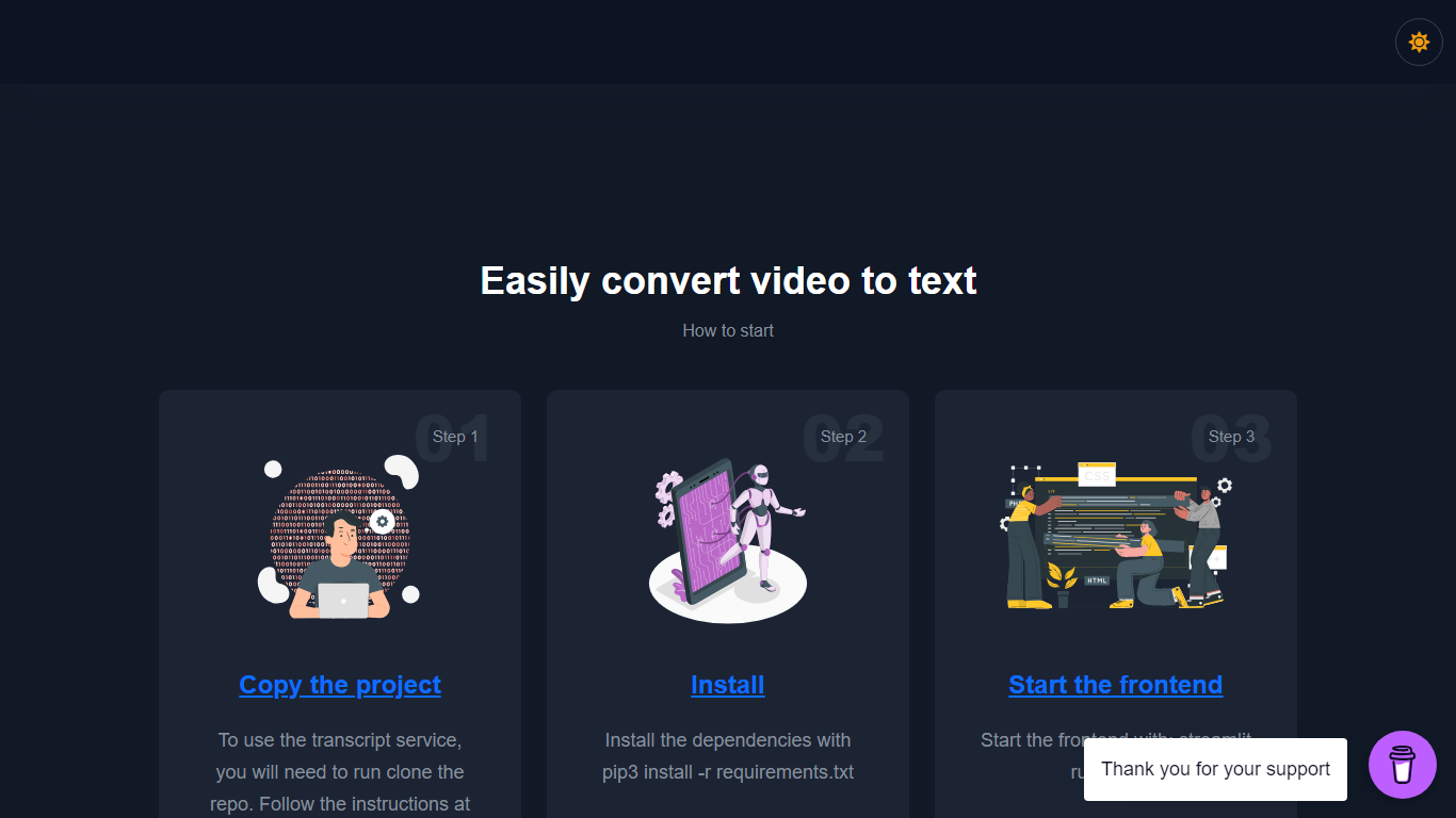 Transform your video content into accurate transcriptions with the Video2Text – Transcribe Videos service. Employing OpenAI Whisper’s advanced algorithms, this converter offers a reliable way to transcribe videos into text, effortlessly. The process is simple: clone the GitHub repository, install the necessary dependencies, and start the frontend. Ideal for a diverse array of users such as researchers, educators, journalists, and content creators, this tool is available for free and is especially helpful if you’re looking to streamline your workflow. The provided instructions ensure a smooth setup so you can begin converting videos with ease. Additionally, your support is welcomed with an optional donation to sustain and enhance the service. For inquiries, you can reach out to the dedicated contact email provided.
