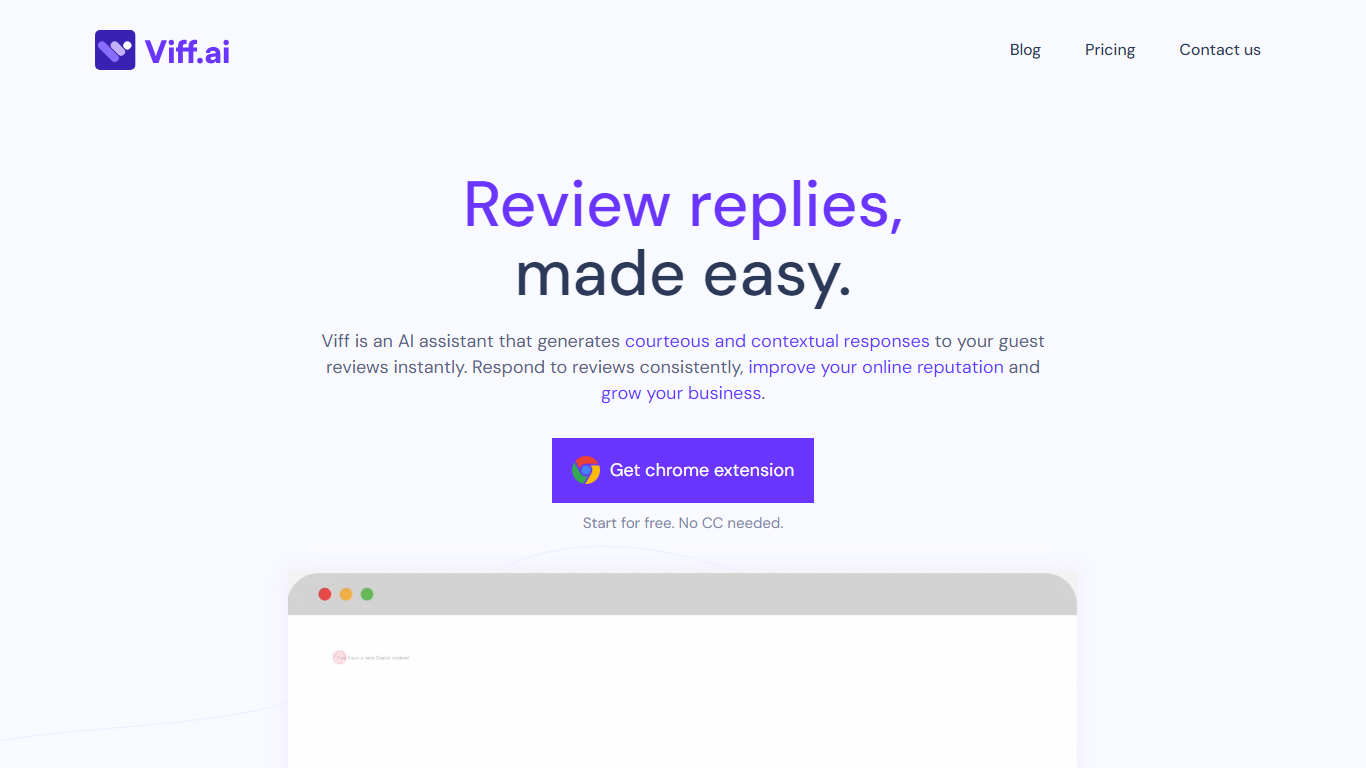 Transform the way you engage with your guests using Viff, the innovative AI assistant designed for prompt, polite, and personalized responses to online reviews. This powerful Chrome extension seamlessly integrates with any Property/Reputation Management System, revolutionizing your customer interactions without the need for additional integrations.