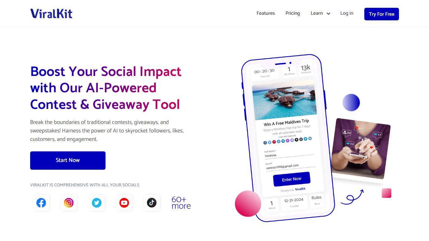 The AI Powered Contests, Giveaways, & Sweepstakes Tool is a revolutionary platform that leverages the power of artificial intelligence to create and manage contests, giveaways, and sweepstakes effortlessly. With this tool, businesses can quickly grow their online presence and engage with their target audience in a fun and interactive way.
