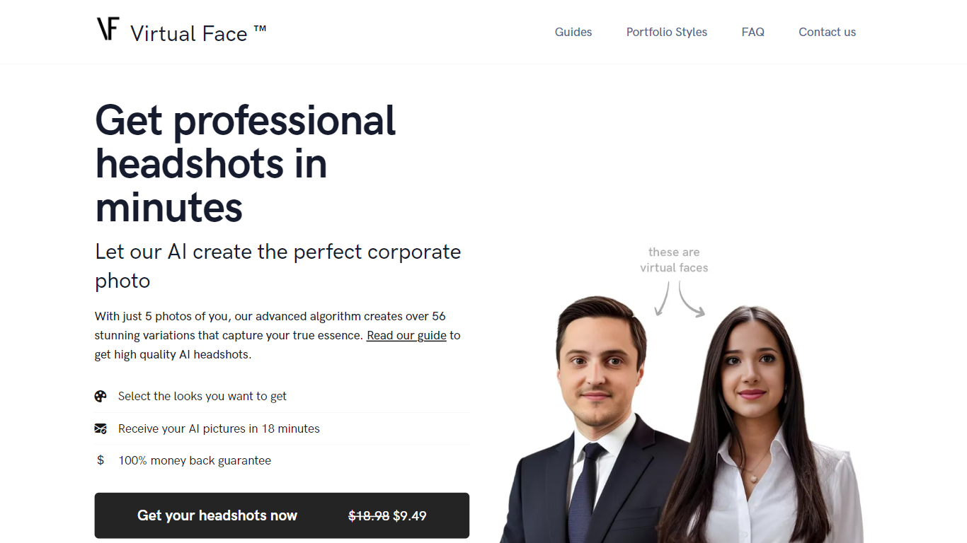 Elevate your professional image with Virtual Face™, the revolutionary platform where high-quality AI-generated headshots are just minutes away. Our sophisticated algorithm, designed for precision and personality, utilizes a set of 5 photos to produce over 56 unique headshots that truly reflect your professional identity. Discover why AI is reshaping professional photography and browse various styling options tailored by our AI to suit your preferences. With an impressive portfolio and a simple three-step process—select your styles, receive pictures swiftly, and enjoy a 100% money-back guarantee—Virtual Face™ is transforming headshots with unprecedented convenience and quality. Benefit from our current promotional offer of $9.49 for a limited time, and join the ranks of 45,000 satisfied professionals who have enhanced their corporate profiles through Virtual Face™.