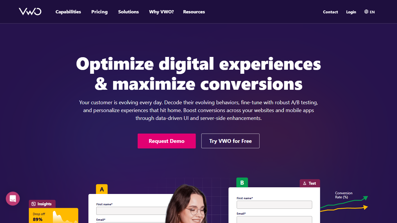 - **Testing:** Build winning experiences across web mobile app and server-side. Integrate split testing multivariate testing Bayesian stats engine and more to optimize your website and enhance user experience.