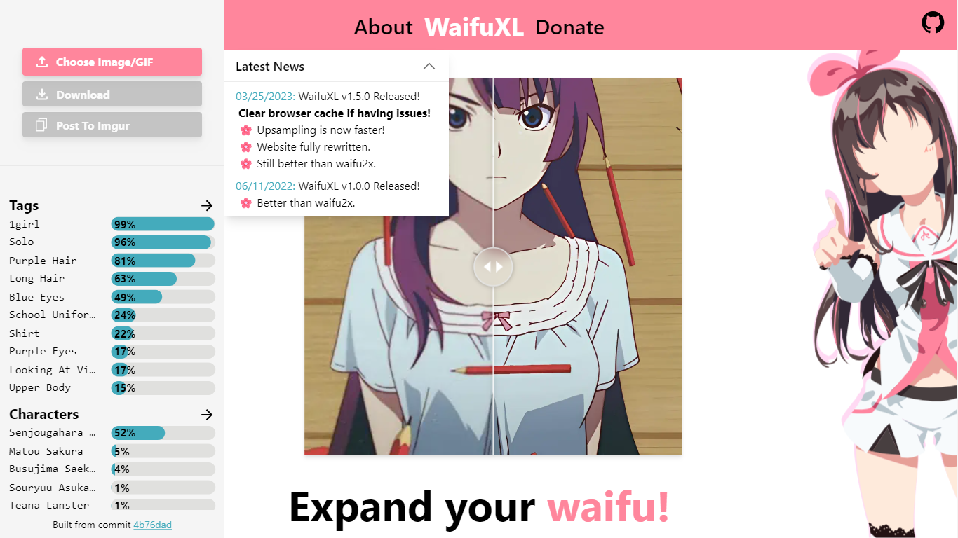 Users can choose images or GIFs to upscale and have options to download the result or post it to Imgur. Waifu XL also provides tags related to anime characters and styles, such as “1girl,” “Solo,” “Purple Hair,” “Long Hair,” and many more. Additionally, there are character-specific tags like “Senjougahara,” “Matou Sakura,” and others.