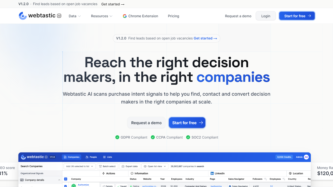 Webtastic.ai is a cutting-edge platform designed to empower digital agencies, freelancers, and consultants with the ability to discover and connect with potential customers effortlessly. With just three clicks, users can leverage sophisticated filters to surface high-quality leads that align with their agency’s growth strategy. The service uses a combination of unique buying signals and purchase intent data to identify decision-makers in target companies who are ready to convert. Webtastic.ai is GDPR, CCPA, and SOC2 compliant, ensuring that data privacy and security standards are upheld. Furthermore, the platform offers seamless integration with CRM systems for efficient lead tracking and management. Whether you’re looking to increase ROI, enhance conversion rates, or close more deals, Webtastic.ai provides a rich repository of data including contact details, social metrics, funding rounds, and web technology usage of leads. Agencies can begin their journey with a free start and can then choose from various competitively priced plans to fit their business size and needs.
