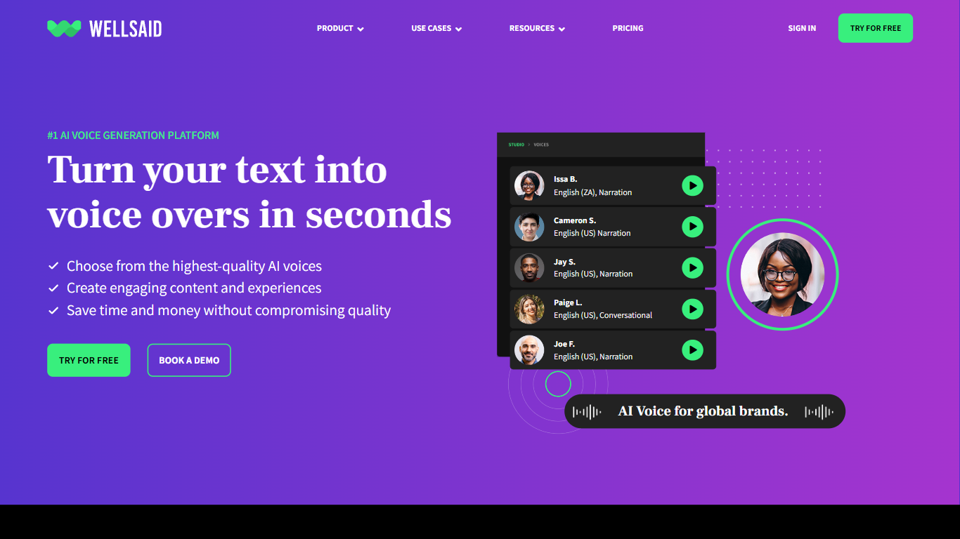 WellSaid Labs is a leading enterprise-grade AI Voice Generator that allows users to create professional voice overs with ease. Whether you need voice overs for videos, podcasts, presentations, or any other form of media, WellSaid Labs provides the highest quality voice to make your content stand out.
