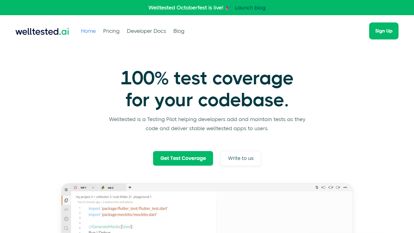 Achieve flawless code with Welltested.ai, the ultimate Testing Pilot designed for developers longing for impeccable and stable software. Our powerful AI-driven solution seamlessly integrates into your development environment as a package, providing a swift path to 100% test coverage for your codebase in just minutes. Perfect for Flutter enthusiasts, Welltested.ai prides itself on generating meaningful tests for a wide variety of architectures and state management choices, empowering you to create robust Flutter and Dart applications for multiple platforms. With the innovative @Welltested annotation, tests generate as you code, simplifying your workflow and enhancing code quality. Our self-learning system continuously improves, ensuring the generated test cases keep getting better. Embrace a streamlined development process with Welltested.ai and deploy with confidence, knowing each PR is stable and well-tested.
