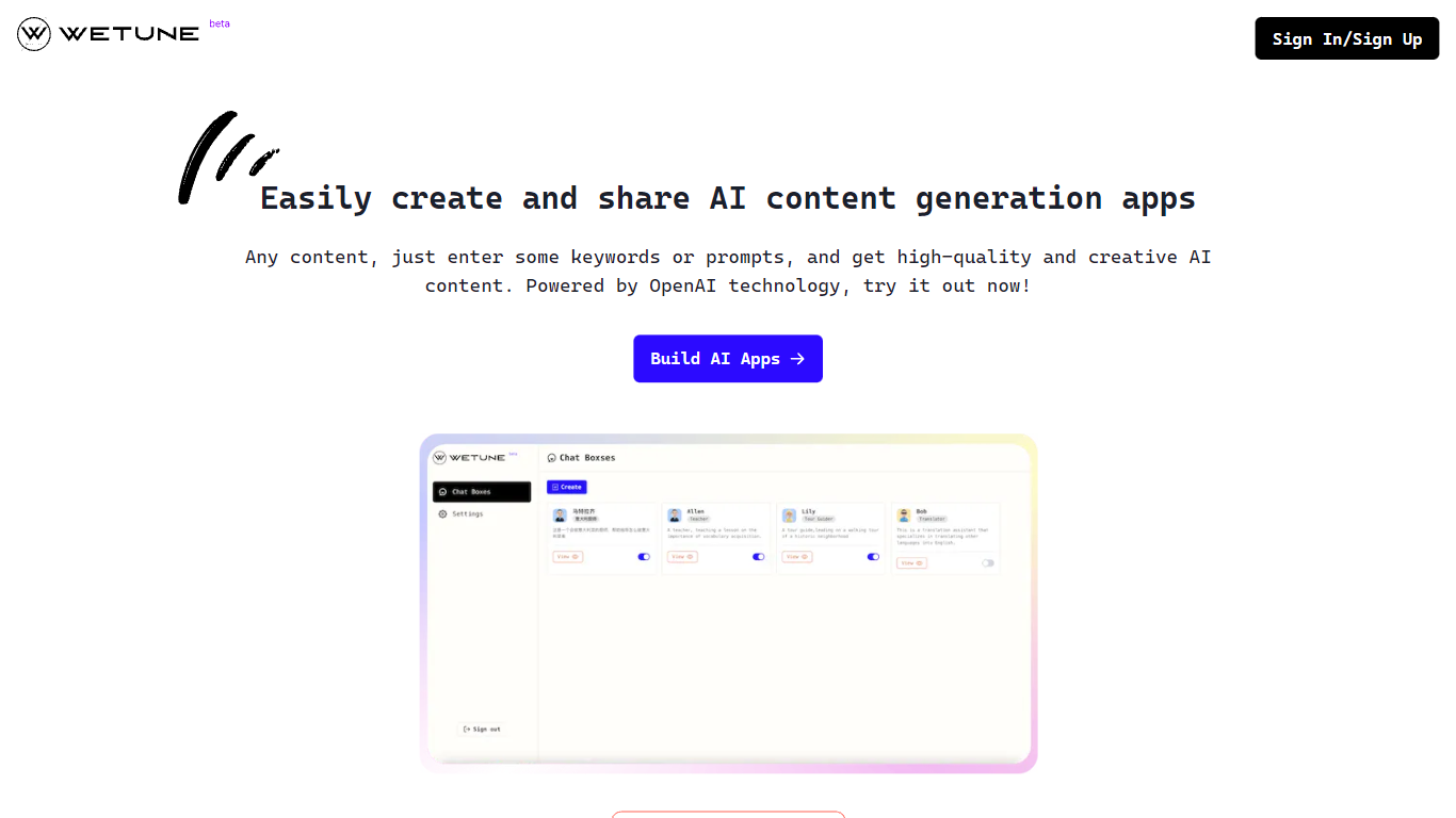 Wetune is a revolutionary no-code platform designed to empower individuals and businesses to build AI-powered applications effortlessly. It’s an innovative tool that simplifies the process of integrating artificial intelligence into apps by eliminating the complexity of coding. With Wetune, you can unleash the potential of AI technology with just a few clicks, making it accessible to non-programmers and seasoned developers alike. The platform’s user-friendly interface and robust features enable rapid prototyping, allowing you to bring your ideas to life quickly and efficiently. Whether you’re looking to automate processes, analyze data, or provide personalized user experiences, Wetune offers the functionality you need to create cutting-edge applications without the steep learning curve of traditional development methods.