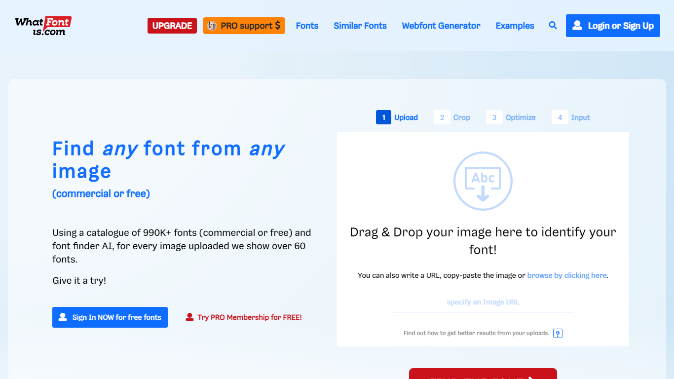Discover the art of typography with Font Finder 🔎 by What Font Is – your ultimate tool for identifying any font from an image. Whether you encounter a stylish font while browsing or need to match a font from a client’s assets, our Font Finder AI is here to assist you. With a vast catalogue of over 990,000 fonts, we offer a treasure trove of options, both commercial and free. Simplify the process with our intuitive four-step system: Upload, Crop, Optimize, and Input to get precise results. Get started for free or elevate your font finding experience with our PRO membership. Enjoy our font detector and good luck in your quest to discover that perfect font!