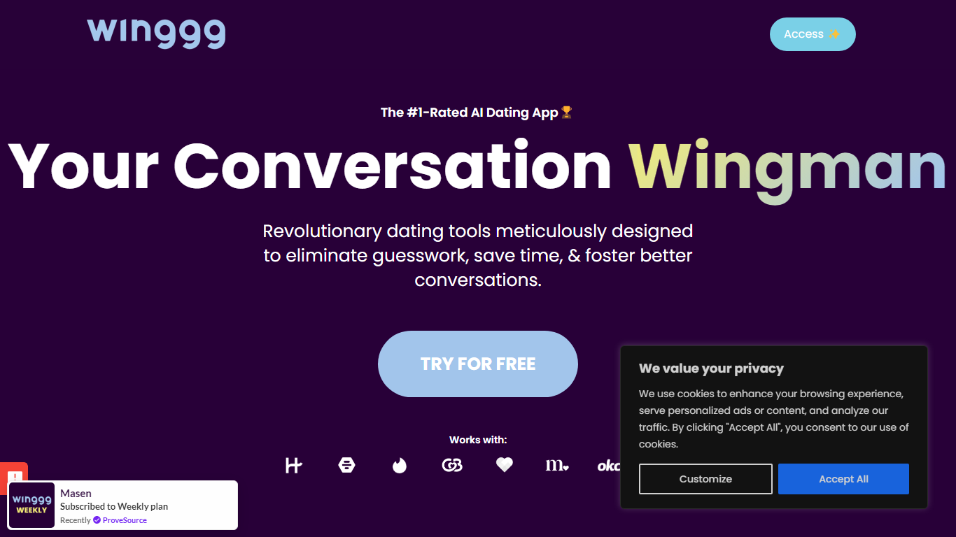 Revolutionize your dating experience with Winggg, the ultimate AI Wingman Dating Assistant! Our smart AI blends seamlessly with your personal style to help craft the perfect text messages and engaging conversation starters. No more second-guessing your approach – Winggg is meticulously designed to navigate the complexities of dating with ease. Whether you’re asking for a date IRL, trying to revive a chat, or fine-tuning your dating profile, Winggg is your go-to assistant, now available to try for free. Simplify your romantic interactions and boost your dating confidence with Winggg by your side.
