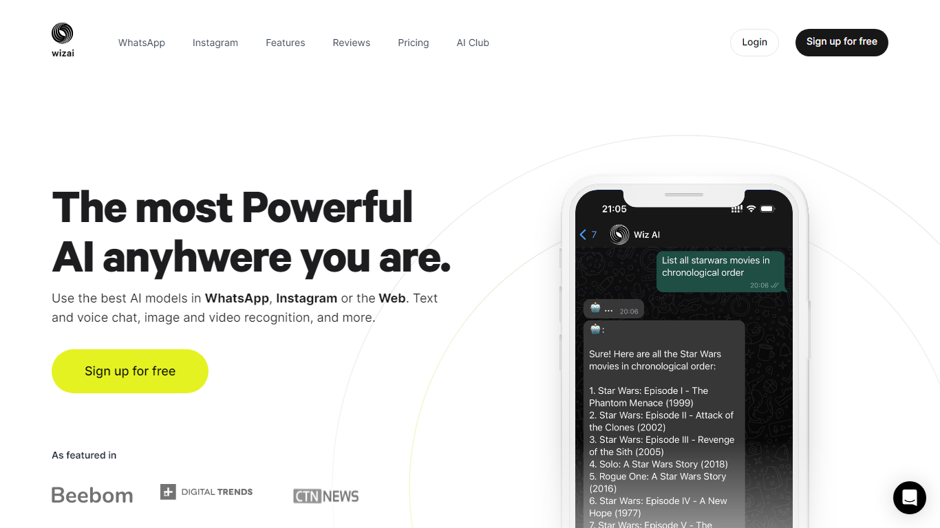 Experience the future of communication with WizAI, your comprehensive AI-powered chatbot for WhatsApp, Instagram, and the Web. Trusted by over half a million users globally, WizAI leverages the best AI models from OpenAI to bring you smart replies and intuitive interactions, any time, anywhere. Connect seamlessly using text or voice, and soon, even images and videos. With daily conversations exceeding 15,000 and millions of messages delivered, WizAI promises a hassle-free, advanced chat experience.