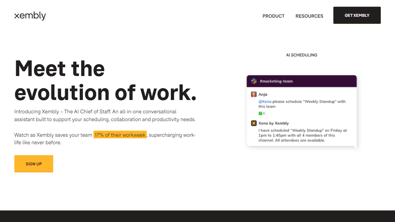 - **Scheduling:** Xembly simplifies the process of scheduling meetings by seamlessly handling details such as scheduling links email communication and calendar management. From simple 1:1 meetings to complex scheduling requests Xembly’s AI assistant Xena takes care of the logistics saving time and reducing scheduling conflicts.