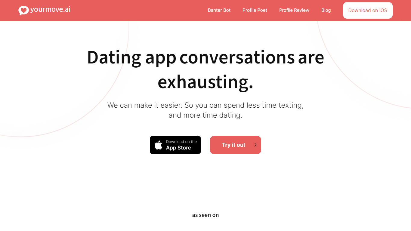 Revolutionize your dating game with YourMove AI, the ultimate AI-powered texting assistant designed to create engaging and witty conversations. With our cutting-edge Banter Bot, Profile Poet, and Profile Review features, we take the hassle out of dating app messaging. YourMove AI helps you send flirty or thoughtful messages tailored to your style, enabling you to focus more on actual dates rather than being buried in your phone. Join the 120,000+ satisfied customers who have experienced a breakthrough in their dating life, supported by a suite of tools that craft personalized openers and comebacks in seconds.