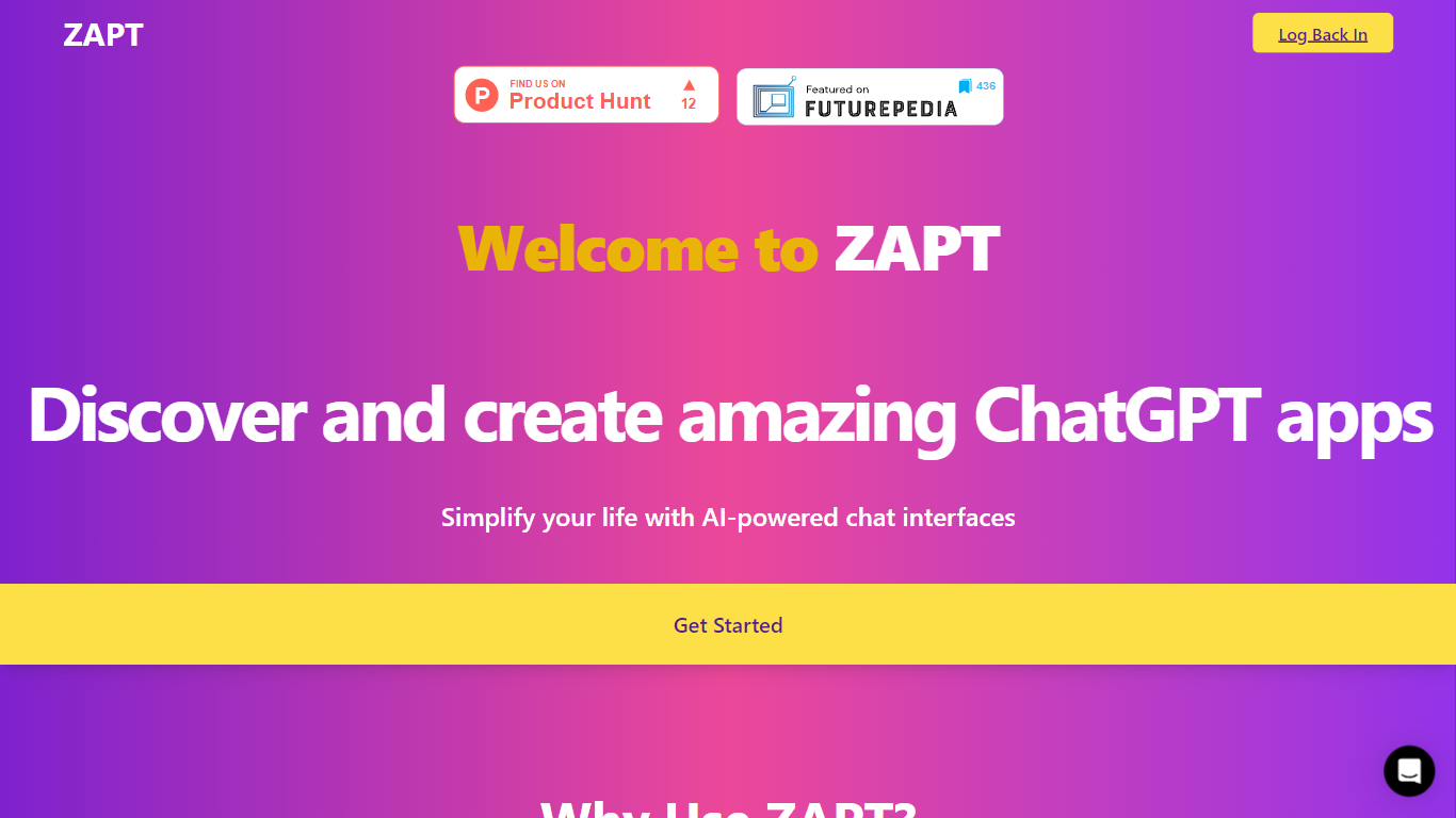 ZAPT is a revolutionary platform that empowers users to discover and create amazing ChatGPT apps. With the power of artificial intelligence, ZAPT simplifies your life by providing AI-powered chat interfaces that can assist you in various tasks and activities. Whether you need help with customer support, content creation, copywriting, project management, research, sales, or any other aspect of your personal or professional life, ZAPT has got you covered.